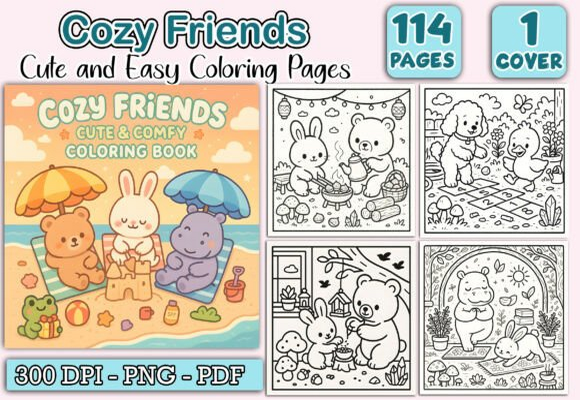 Step into a warm and welcoming world with 114 Cozy Friends Cute & Easy Coloring Pages — a heartwarming collection celebrating friendship, kindness, and joyful moments between animals, children, and grown-ups. Each illustration features soft, expressive characters in sweet everyday scenes: sharing tea, reading together, walking in the park, or simply enjoying quiet time side by side.